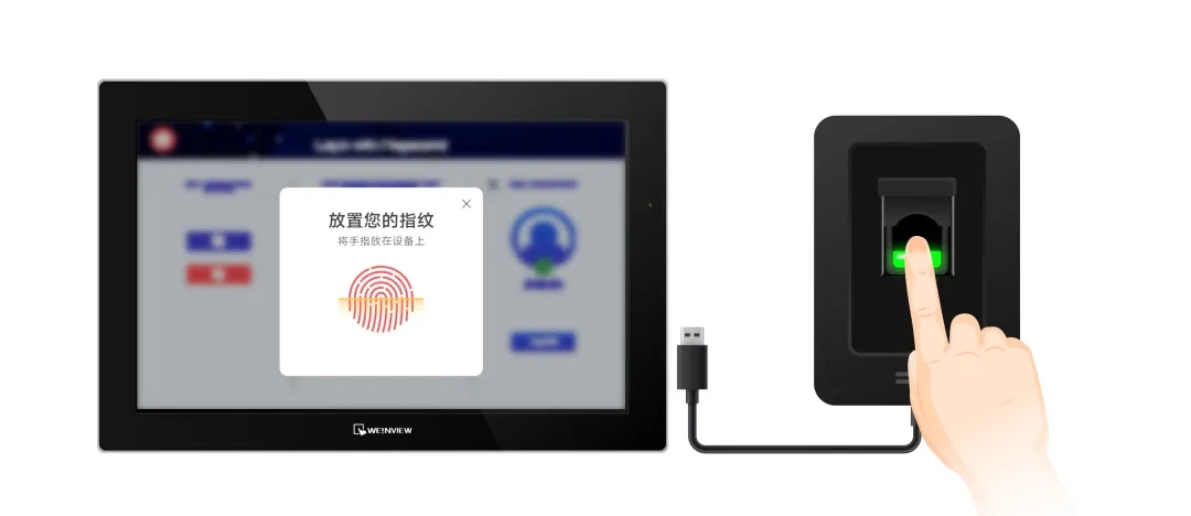 威綸通HMI通過USB連接指紋機(相關(guān)型號可咨詢威綸通工作人員),可進行指紋身份驗證。用戶只要將手指放在指紋機上,即可完成身份驗證,并登錄人機系統(tǒng)。指紋識別驗證依靠生物特性更難以被仿冒,其安全性更上一層樓。
